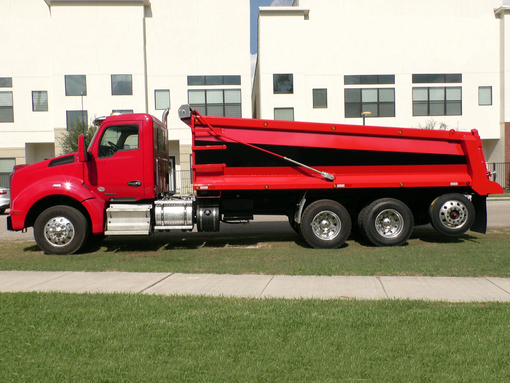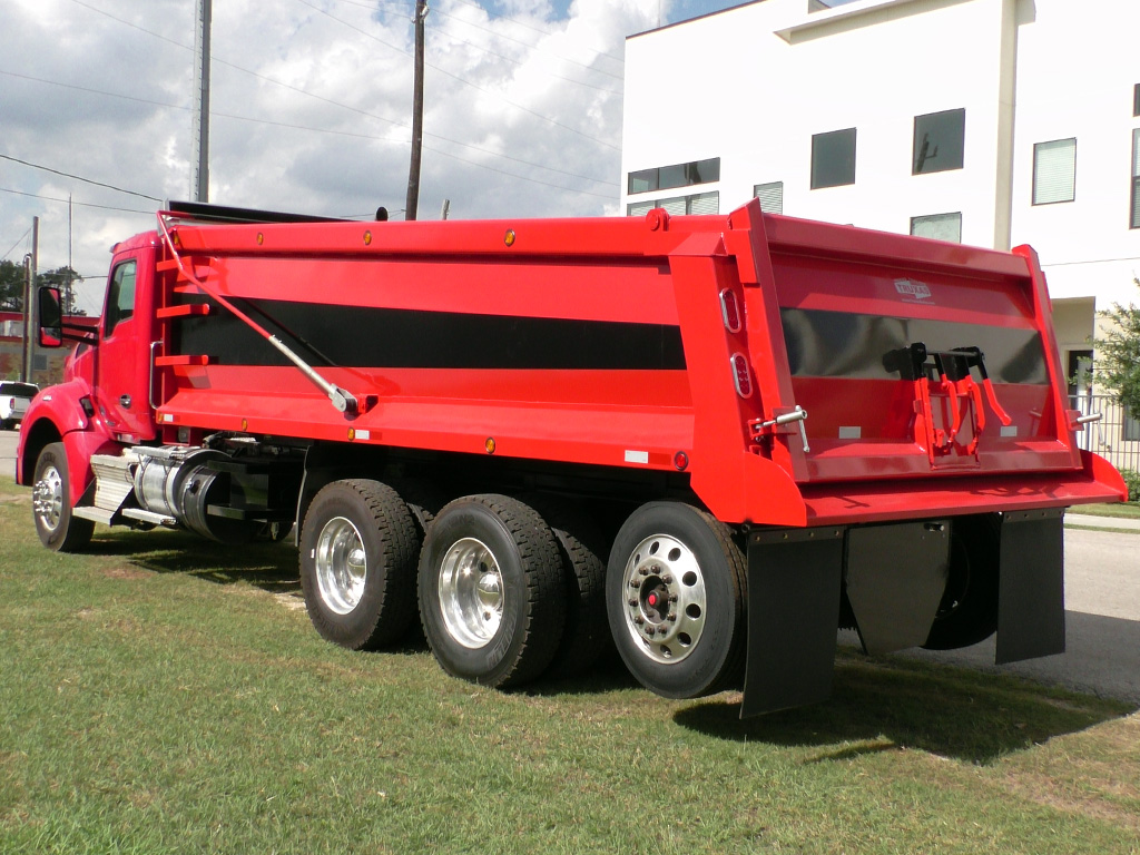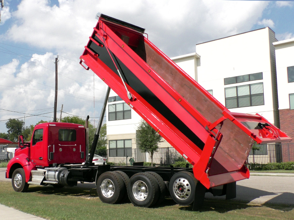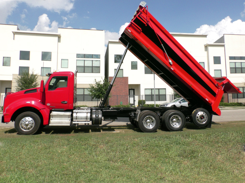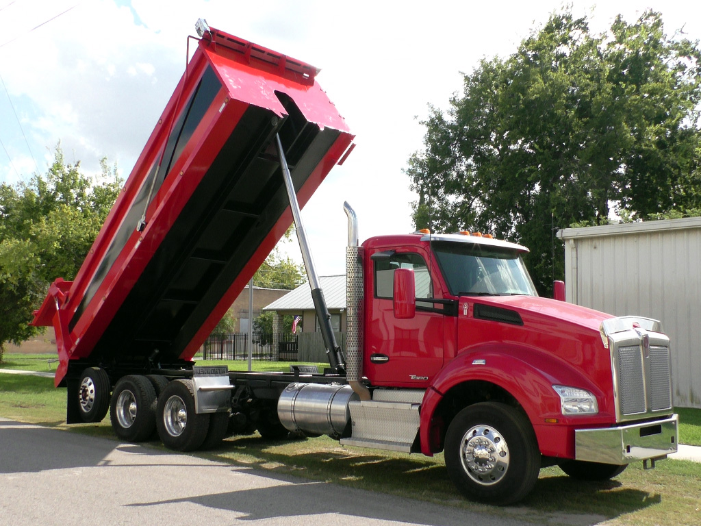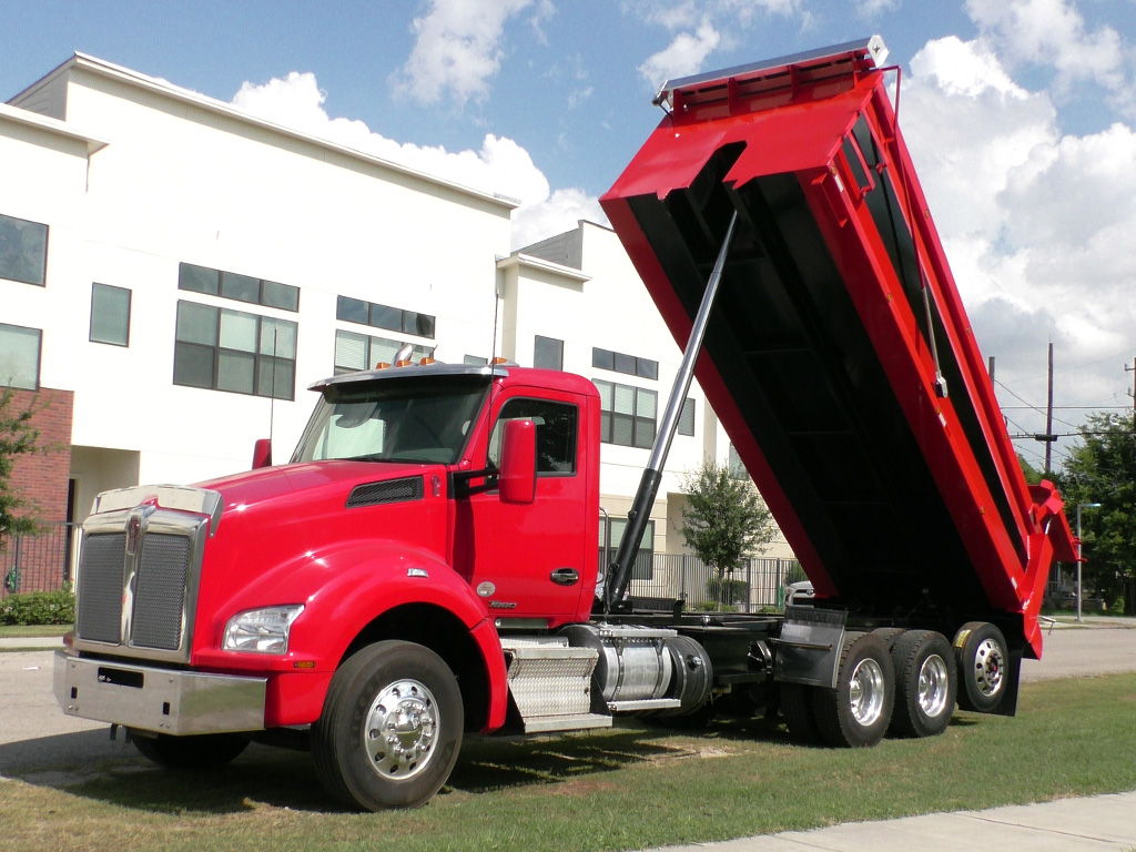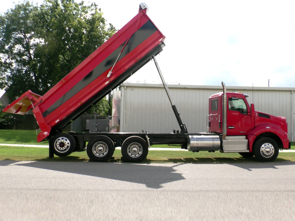2015 Kenworth T880 4-axle with New 20ft Max Lane Dump Body, steerable lift axle, steel electric tarp system, high lift tailgate with single trench gate.
