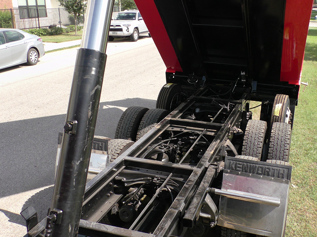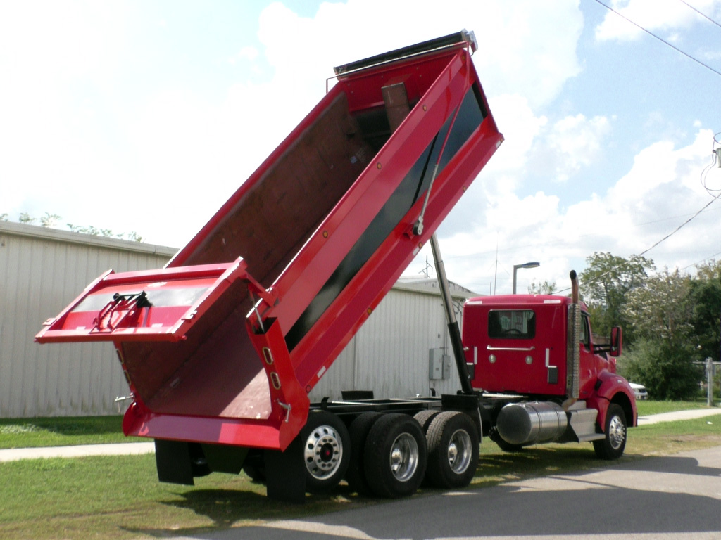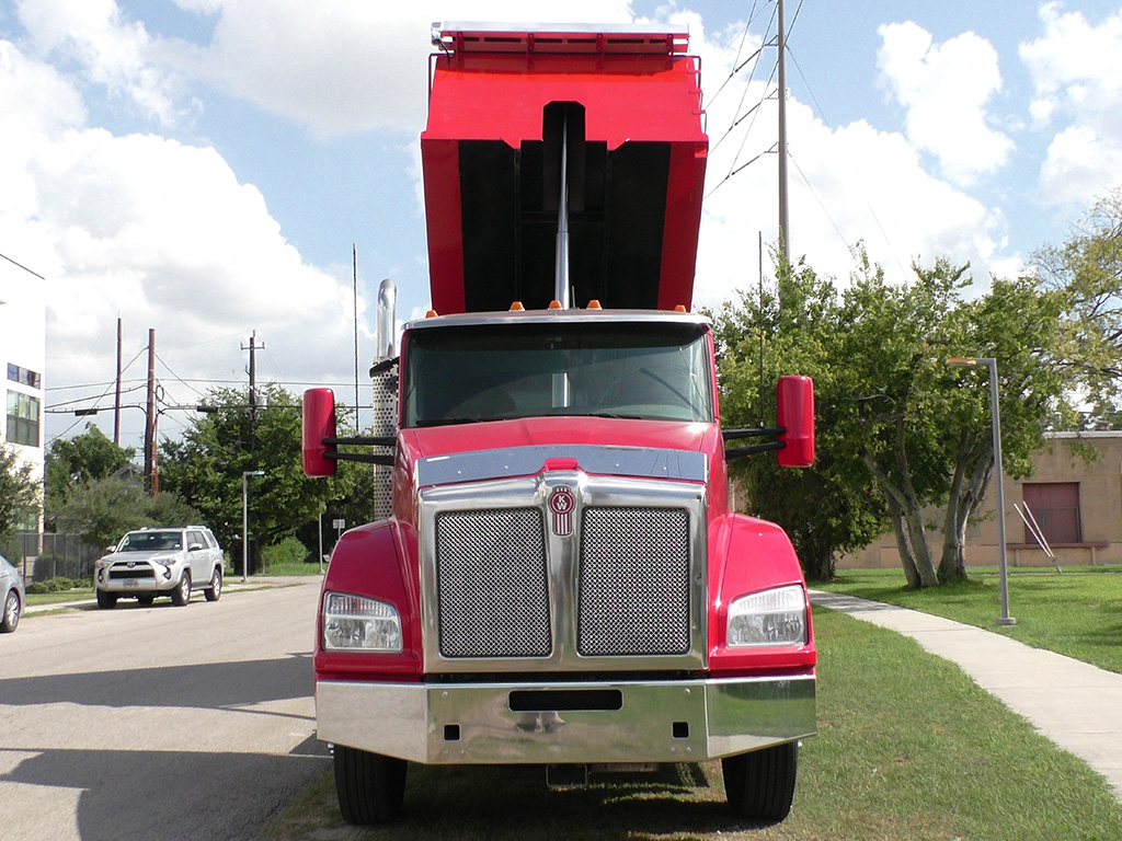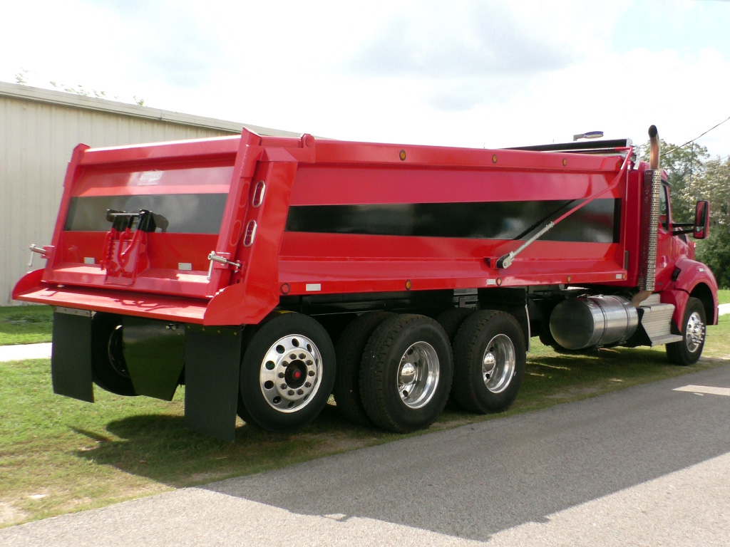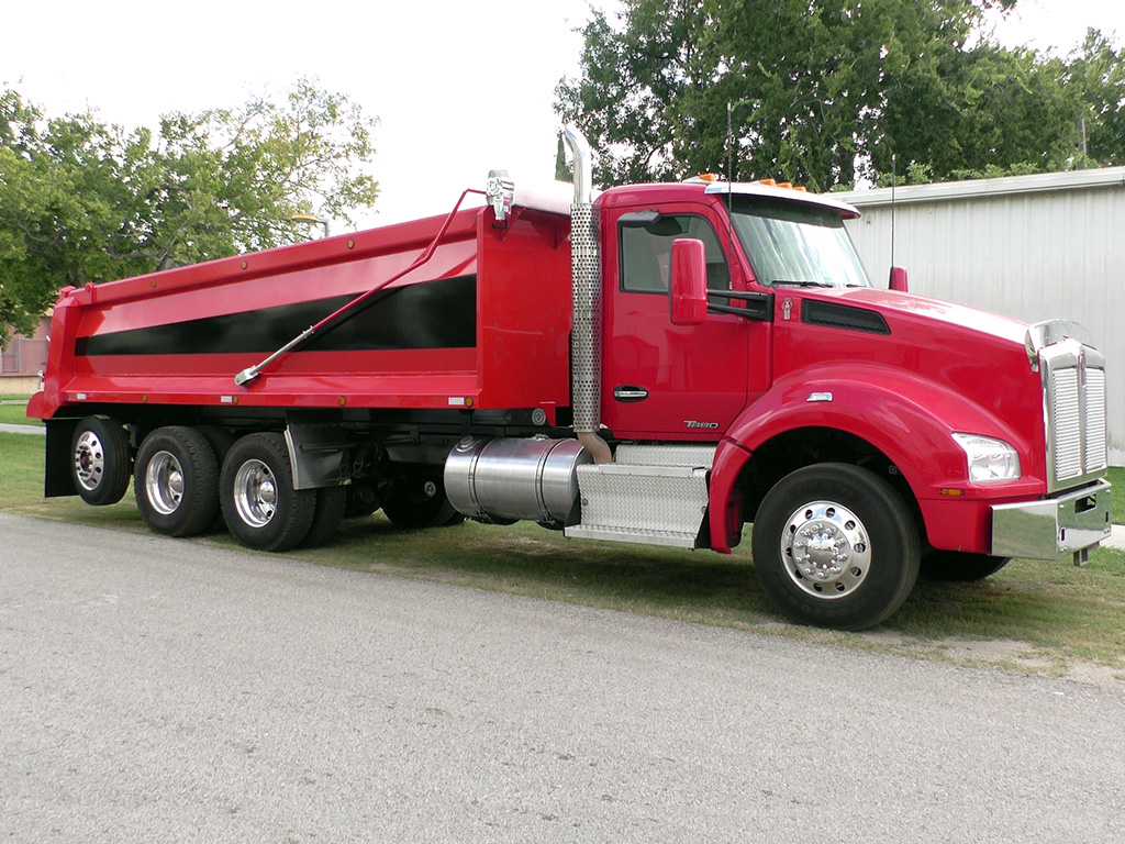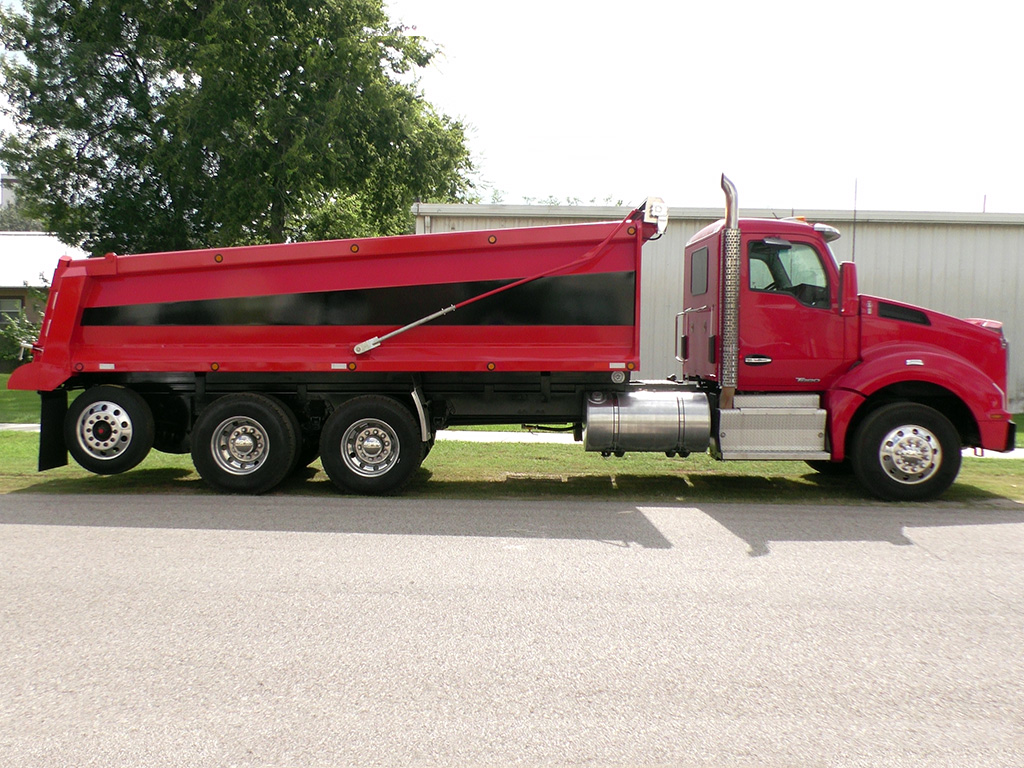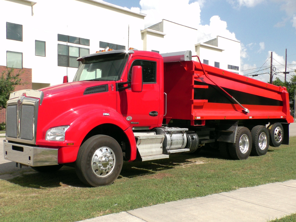 2015 Kenworth T880 4-axle with New 20ft Max Lane Dump Body, steerable lift axle, steel electric tarp system, high lift tailgate with single trench gate.
