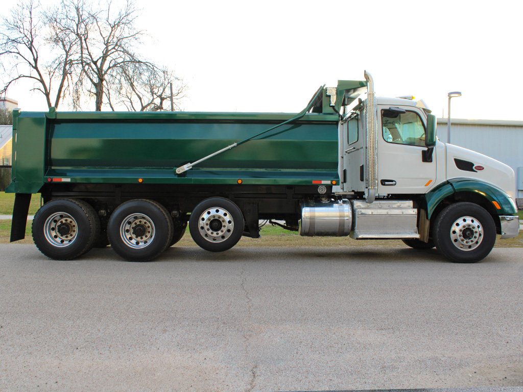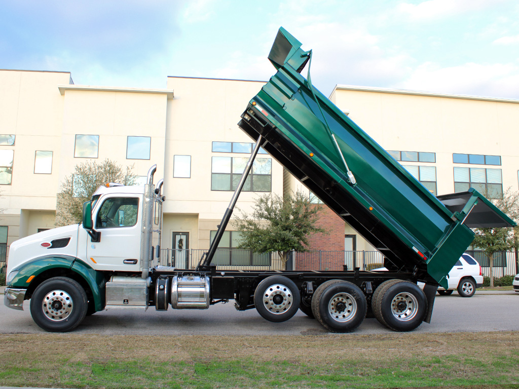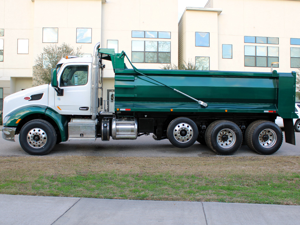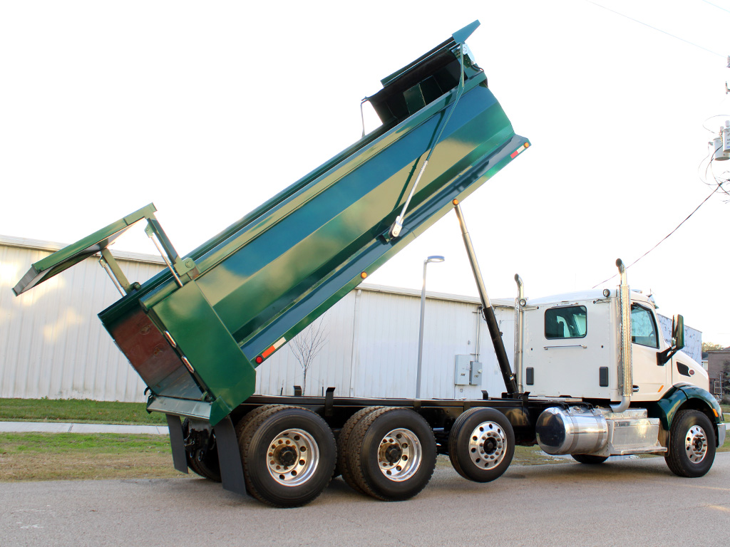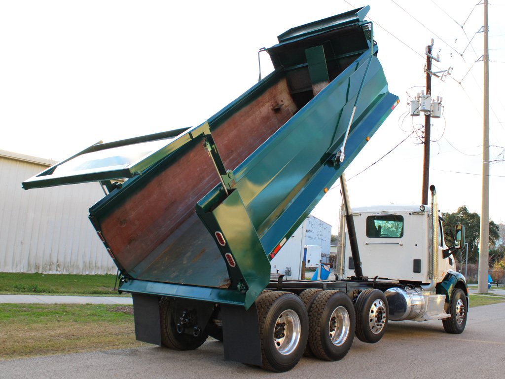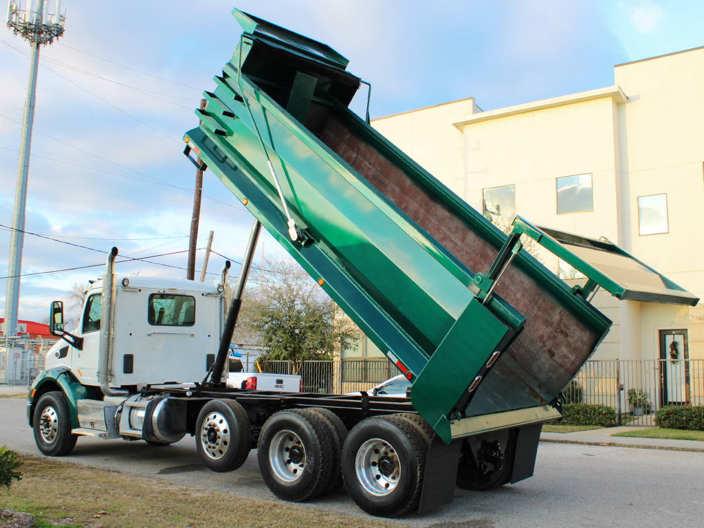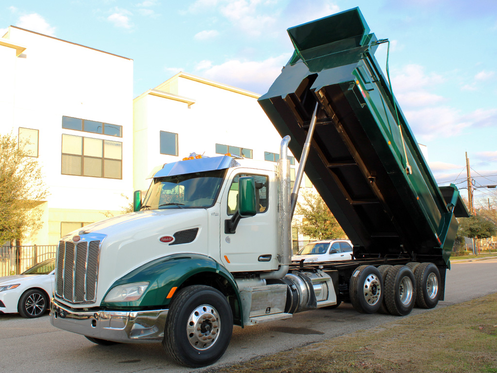 2016 Peterbilt 579 with New HD Load Lane Dump Body, including aluminum electric tarp, steerable lift axle, upgraded front suspension, and high lift tailgate.
