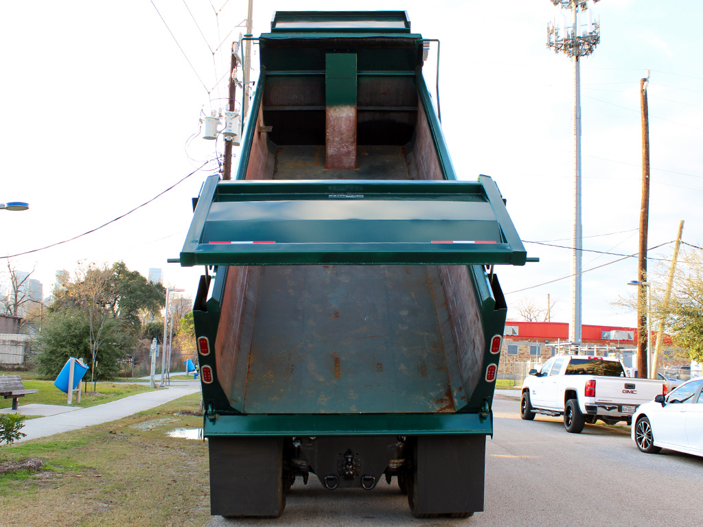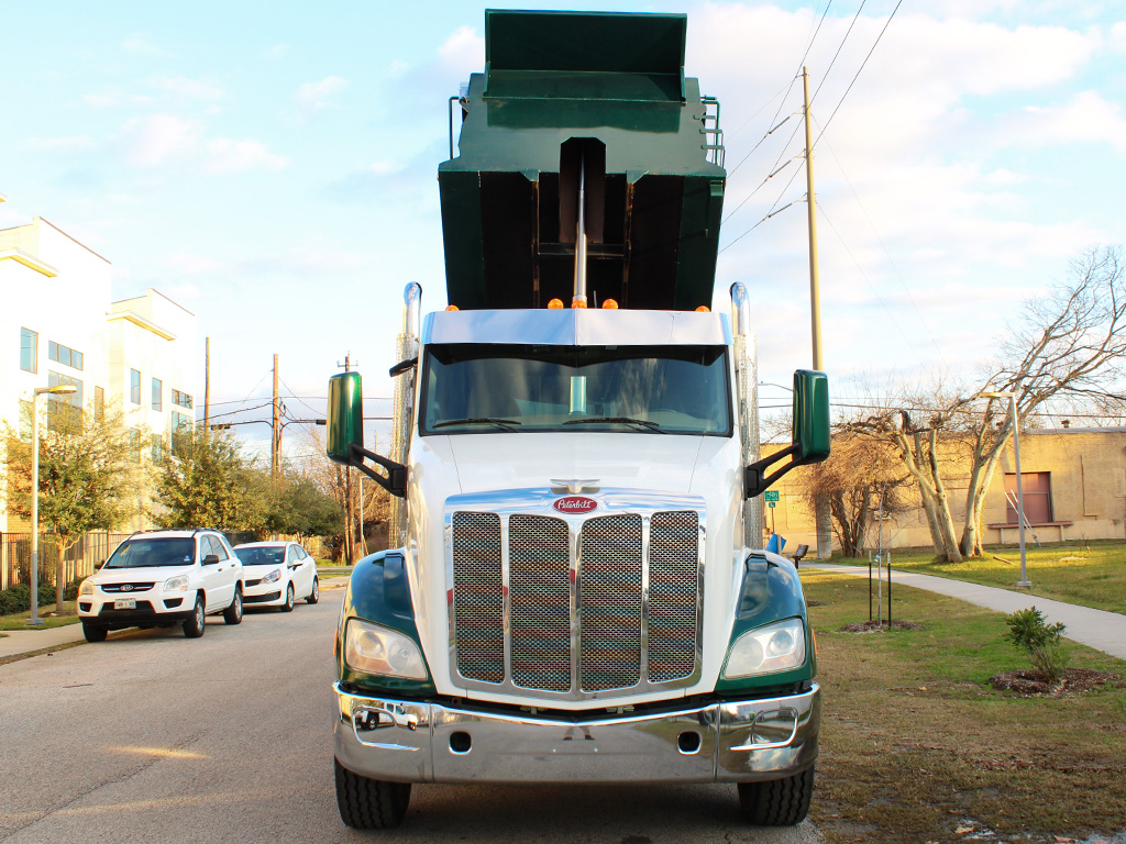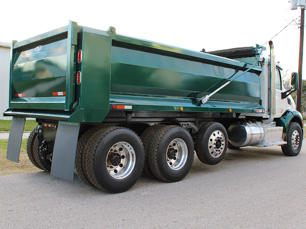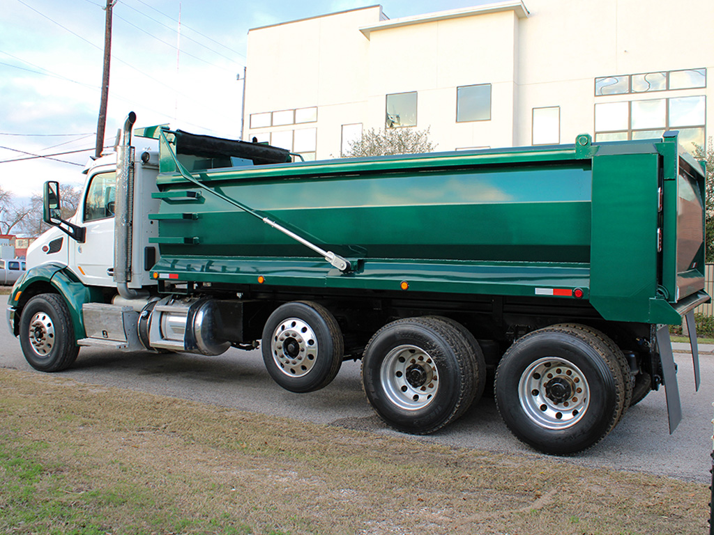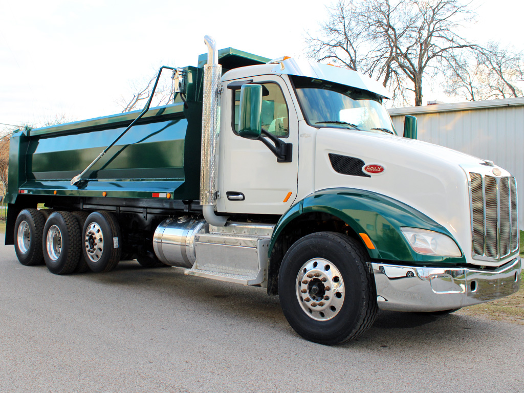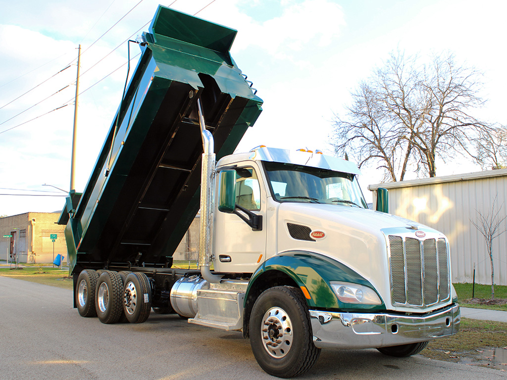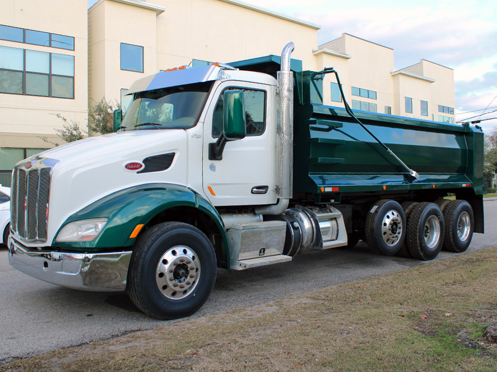 2016 Peterbilt 579 with New HD Load Lane Dump Body, including aluminum electric tarp, steerable lift axle, upgraded front suspension, and high lift tailgate.